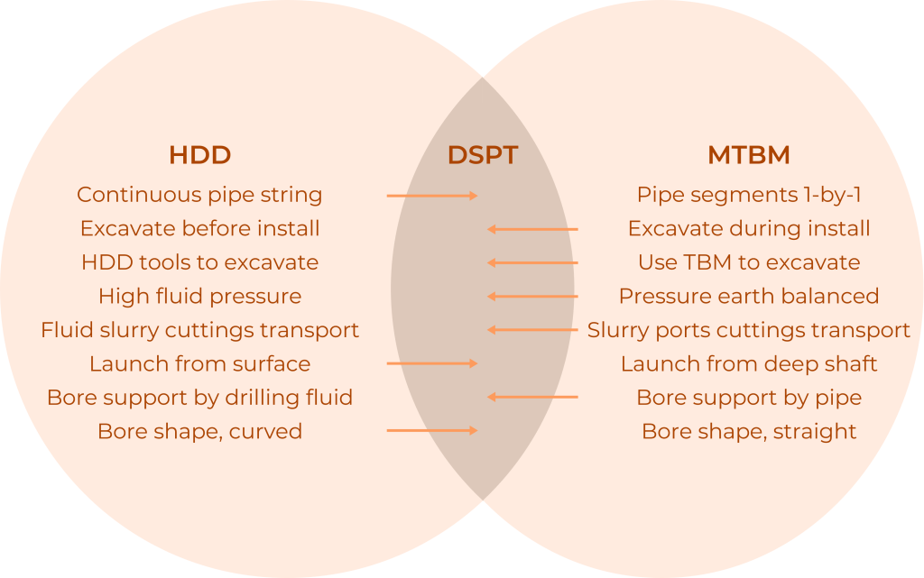 One of the most recent trenchless methods to be developed, Direct Steerable Pipe Thrusting (DSPT), known as the DirectPipe® method, represents a hybrid technique combining elements of HDD and microtunneling.
